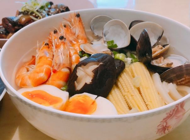 - 材料:蝦子(去腸泥)、蛤蜊(吐沙2小時)、魷魚切圈。