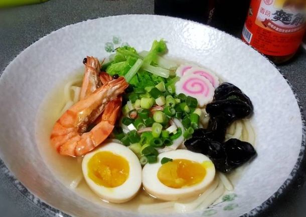 - 材料:烏龍麵、湯底、海鮮、調味料(醬油1匙、味醂半匙)。