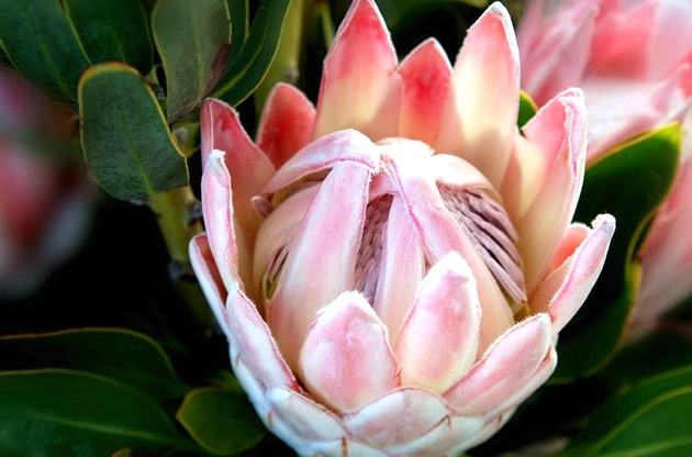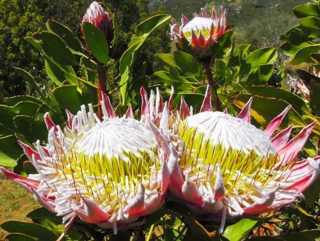- 葉片: 帝王花的葉子也不是配角。它們通常很大片,形狀是寬橢圓形或長卵形,質地厚實革質,邊緣光滑或有時候帶點波浪。葉色是深綠色,表面有光澤,有些品種新葉會帶點紅色調。整體植株形態給人一種粗壯、有力、穩重的感覺。